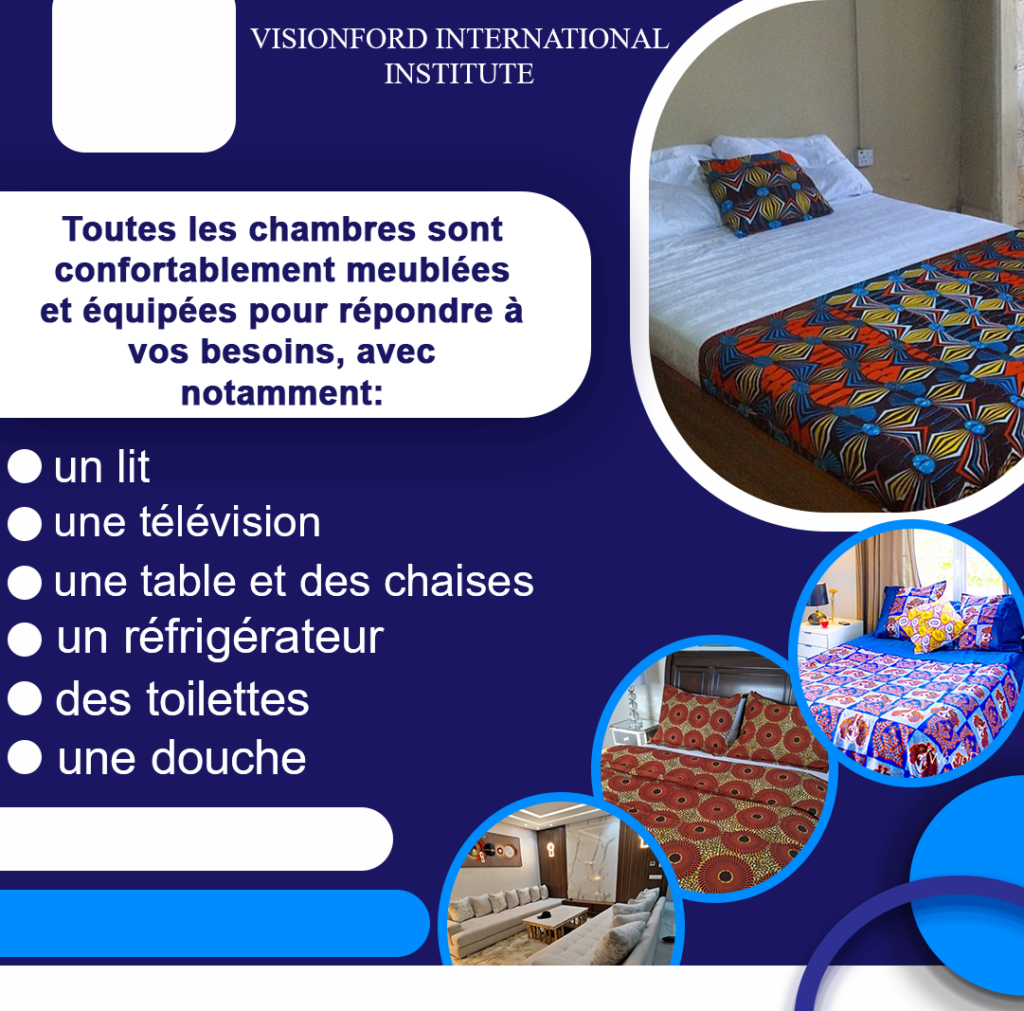 HEBERGEMENT Toutes les chambres sont confortablement meublées et équipées pour répondre à vos besoins, avec notamment: Coût des chambres PériodeFrais (CFA) 1 moisUne (1) personne par chambreDeux (2) personnes par chambre 85.00045.000 100.00050.000 120.00075.000 150.00080.000 200.000100.000 Nous proposons des hostels exécutifs confortables et bien équipés, avec des options telles que:– la climatisation (sur demande)– la télévision– le réfrigérateur (frigo) Nous nous adaptons à vos besoins, n’hésitez pas à nous contacter pour plus d’informations.